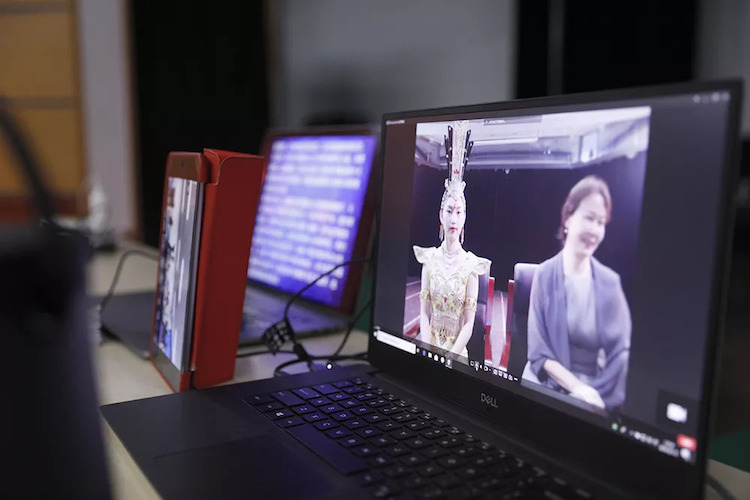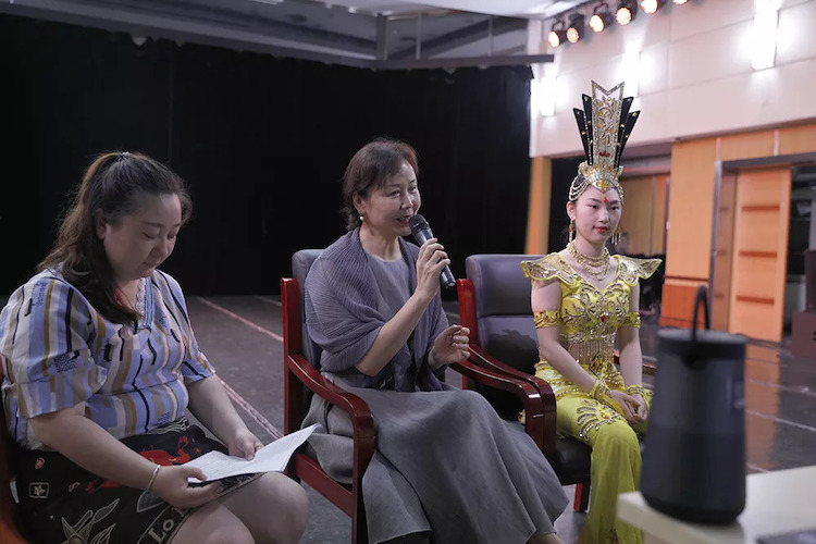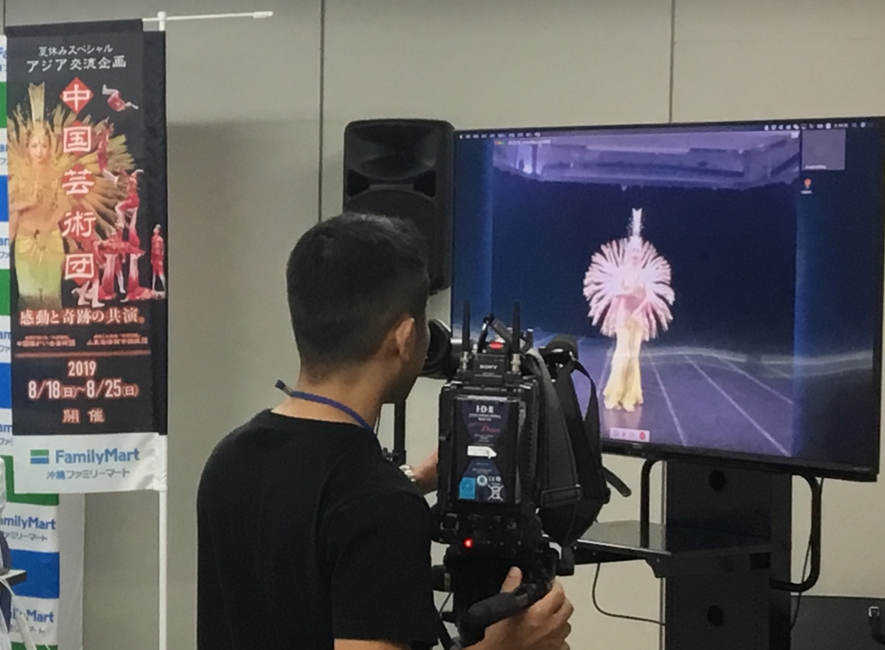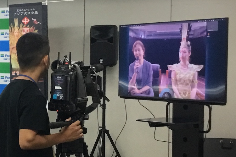 野崎社長のご挨拶と平良常務の本公演ご説明の後に、北京の障がい者芸術団とライブ動画配信を繋がり、今回中国障がい者芸術団沖繩公演団団長の王晶様と団員の高焱霞様に、芸術団の紹介、今回公演の見どころ及び沖縄の皆様へのメッセージをいただきました。